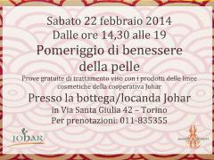 22/02/2014 - 14:30 La cooperativa Johar e il circolo Shantiescianti organizzano un pomeriggio dedicato al benessere della pelle, con prove gratuite di trattamento viso con i prodotti...