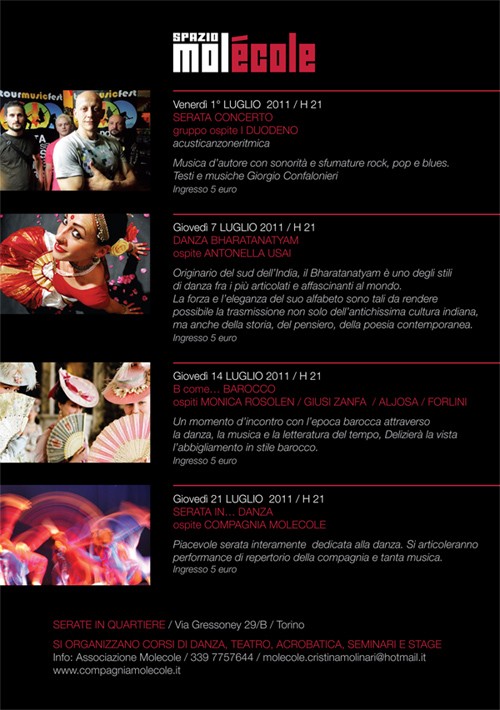 Giovedì 7 giugno 2012 l'Associazione Molecole propone uno spettacolo di danza Bharatanatyam con la presenza come ospite di Antonella Usai. Originario del sud dell'India, il Bharatanatyam è uno degli stili di danza tra i più articolati e affiscinanti al mondo. La forza e l'eleganza del suo alfabeto sono tali da rendere possibile la trasmissione non solo dell'antichissima cultura indiana, ma anche della storia, del pensiero, della poesia contemporanea.