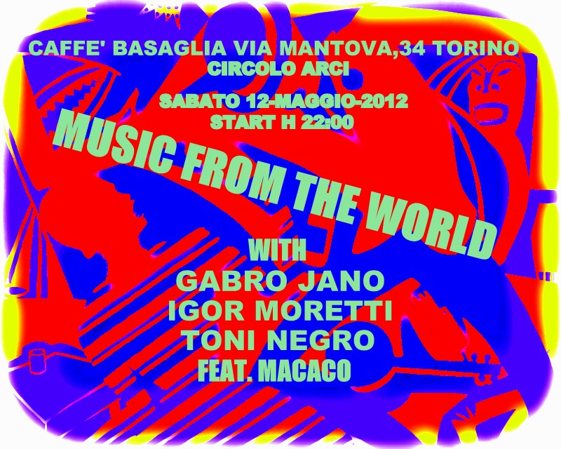 Una serata all'insegna della World music e non solo, selezionata da tre esperti DJ, che danno alla ricerca di musica di qualit la massima importanza. Per farvi vivere una serata speciale con la musica da tutto il mondo. Si divideranno la console Gabro Jano-Igor Moretti e Tony Negro. Per chi volesse cenare,ci sarà il menù composto da: un primo,un secondo e contorno,un quarto di vino o birra piccola o bibita e caffè per un contributo di 14 euro.