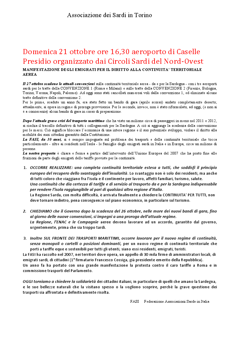 La Fasi, da 30 anni, si è sempre impegnata sul problema dei trasporti e della continuità territoriale che tocca particolarmente - oltre ai residenti nell’Isola - le famiglie degli emigrati sardi in Italia e in Europa, circa un milione di persone.