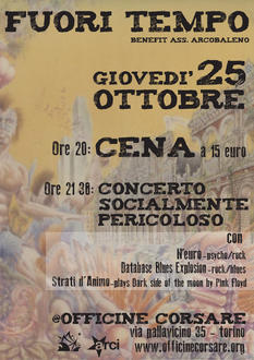 Il circolo ARCI Officine Corsare vi invita alla serata benefica “Fuori tempo” per finanziare i numerosi percorsi di integrazione sociale sostenuti dall’Associazione Arcobaleno.