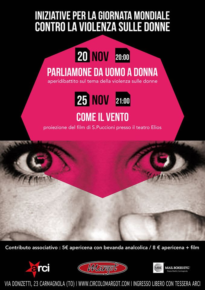 Contributo associativo: 5€ (apericena e bevanda analcolica) oppure 8€ (apericena con bevanda analcolica e biglietto per il film "Come il vento" di Marco S.Puccioni, proiettato martedì 25 novembre in occasione della giornata mondiale contro la violenza sulle donne.