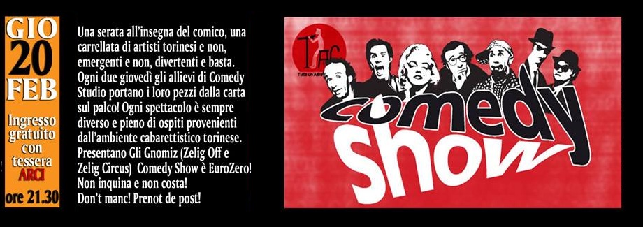 Comedy Show! Una serata all’insegna del comico, una carrellata di artisti torinesi e non, emergenti e non, divertenti e basta. Ogni due giovedì gli allievi di Comedy Studio portano i loro pezzi dalla carta sul palco! Ogni spettacolo è sempre diverso e pieno di ospiti provenienti dall’ambiente cabarettistico torinese.