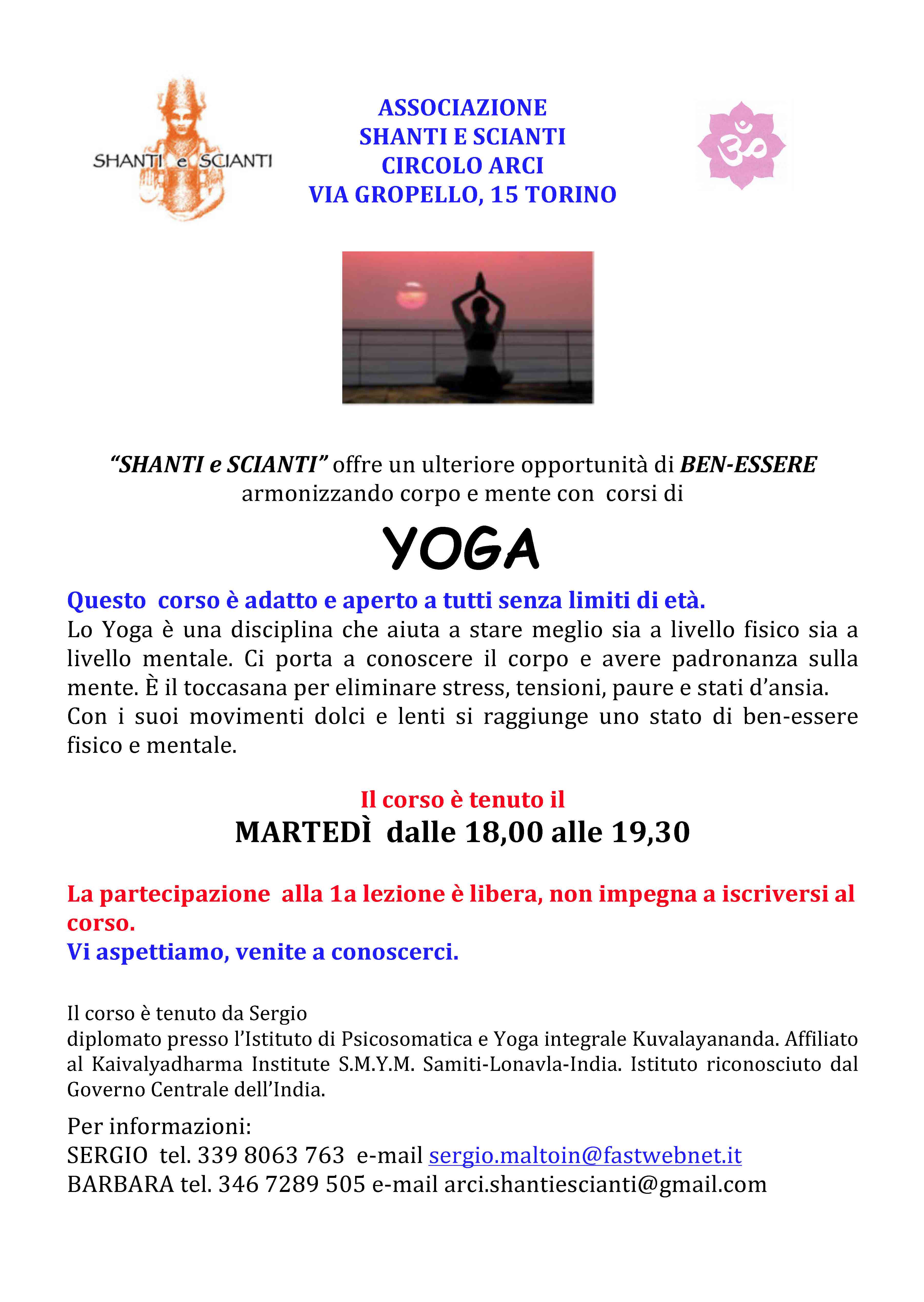 Il Circolo ARCI Shanti e scianti organizza un corso di yoga, a cadenza settimanale, ogni martedì e giovedì, dalle 18.00 alle 19.30, presso la propria sede, in via Gropello 15 – Torino.