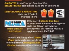 02/05/2014 - 14:00 03/05/2014 - 14:00 04/05/2014 - 14:00 05/05/2014 - 14:00 06/05/2014 - 14:00 07/05/2014 - 14:00 08/05/2014 - 14:00 09/05/2014 - 14:00 10/05/2014 - 14:00 11/05/2014 - 14:00 Diretta Radio Manila e biglietteria ogni giorno dal 2 al 12 maggio. Con interviste ai protagonisti del Festival, musica e aggiornamenti in diretta.