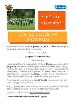L'Associazione Puzzle cerca 4 giovani dai 18 ai 25 anni, interessati a partecipare allo scambio internazionale "Embrace diversity!", che si svolgerà dal 27 agosto al 5 settembre a Zilina, in Slovakia.