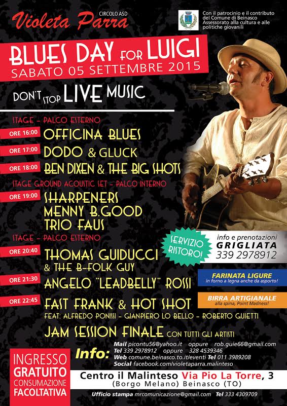 Quindici anni di grande musica, di passione per il blues e la sua storia, con occhi rivolti verso l'avanguardia e anche verso tutti quei gruppi che portano avanti la tradizione e cercano un palco sul quale comunicare. Torna, al Centro “Il Malinteso” di Beinasco, sabato 5 settembre il “Blues Day”, quest'anno in memoria del compianto Luigi Tempera, raffinato e originale chitarrista blues e veterano della scena musicale italiana che ci ha lasciato lo scorso anno e ha ideato, insieme a Piero Contu, il Beinasco Blues & Jazz Festival poi confluito nel “Blues Day”, portato avanti con grande dedizione per ben quattordici anni insieme. La prima edizione senza Luigi, lo storico direttore artistico dell'evento, che ha lasciato un vuoto enorme nelle vite di chi lo amava, ma che aveva un desiderio al quale siamo chiamati a rispondere: continuare a organizzare ogni anno il festival, per diffondere la cultura blues e dare ai giovani la possibilità di emergere.