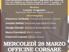 28/03/2012 - 17:30 Alle Officine Corsare mercoledì 28 marzo si discute di lavoro e libertà e etica del lavoro. Il dibattito comincerà alle 17.30 e sarà moderato da Luciano Pregnolato, segretario...