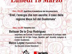 19/03/2012 - 19:30 Le Officine Corsare (Torino) incontrano Baltazar De la Cruz Rodriguez, segretario del Cocode (consiglio comunitario di sviluppo della comunità Ixil di San Felipe) ed esponente...