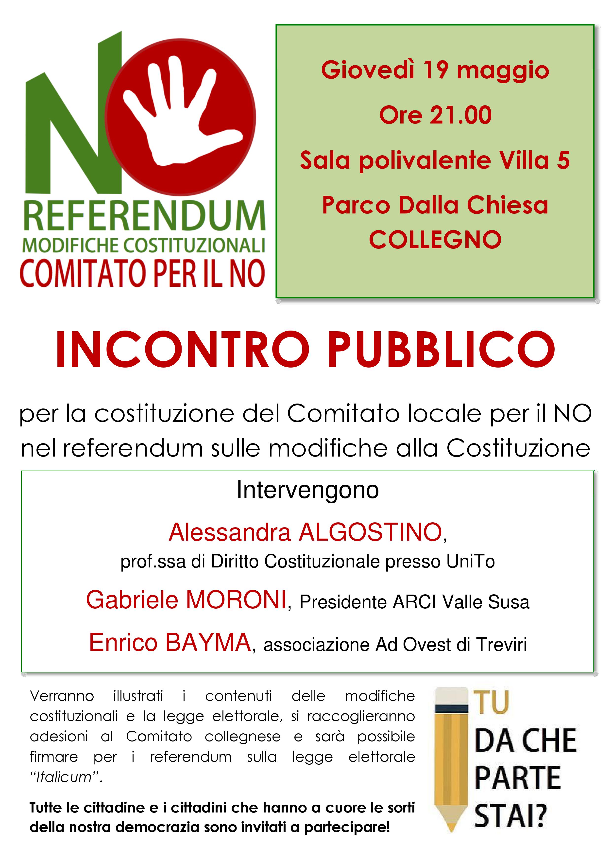 Verranno illustrati i contenuti delle modifiche costituzionali e la legge elettorale, si raccoglieranno adesioni al Comitato collegnese e sarà possibile firmare per i referendum sulla legge elettorale "Italicum".